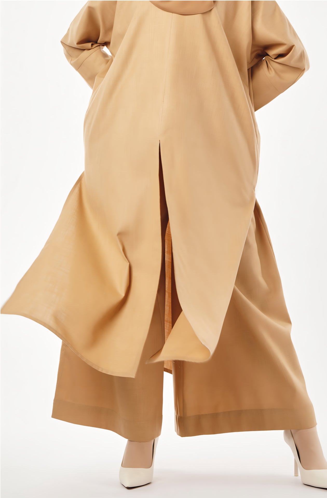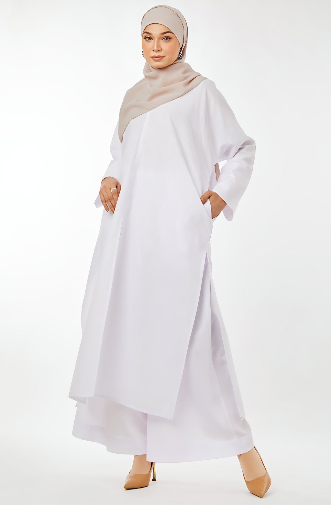 Kaftan ini diserikan dengan leher āVā yang memikat dan poket di kedua-dua sisi, menambahkan praktikaliti dalam rekaan yang memukau. Dipadankan dengan seluar potongan lurus dan longgar, lengkap dengan pinggang elastik dan tali cerut untuk lebih keselesaan. Poket tersembunyi di seluar juga memberikan kemudahan untuk menyimpan barang-barang kecil anda.