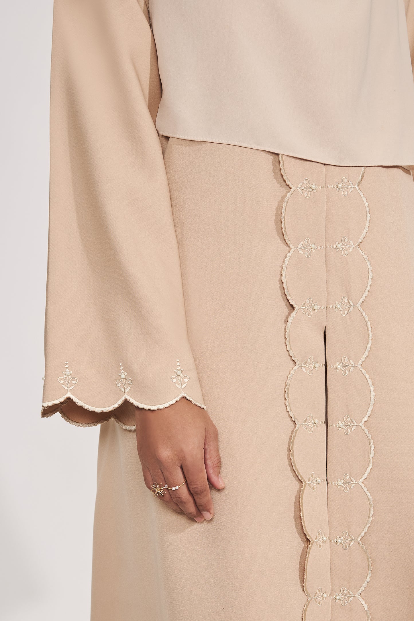 Kebaya ini dihiasi dengan sulaman halus pada bahagian bawah baju dan pergelangan tangan, ditambah dengan hiasan mutiara minimal yang memberikan sentuhan elegan sederhana tanpa berlebihan.
