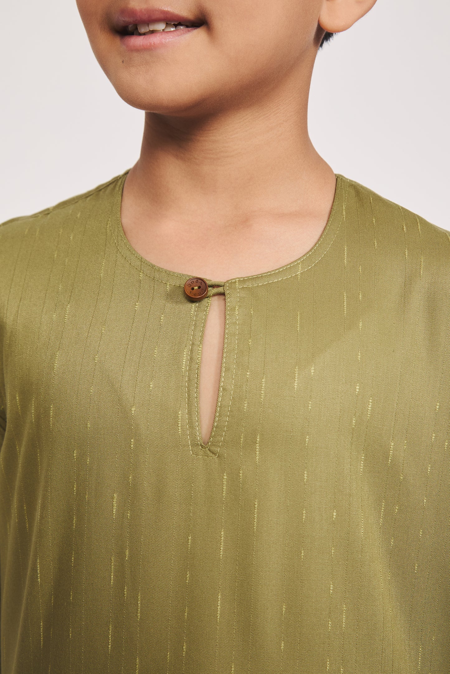 Leher bulat teluk belanga dilengkapi butang kayu klasik menambah sentuhan tradisional yang menjadikan anak anda kelihatan segak dan comel.