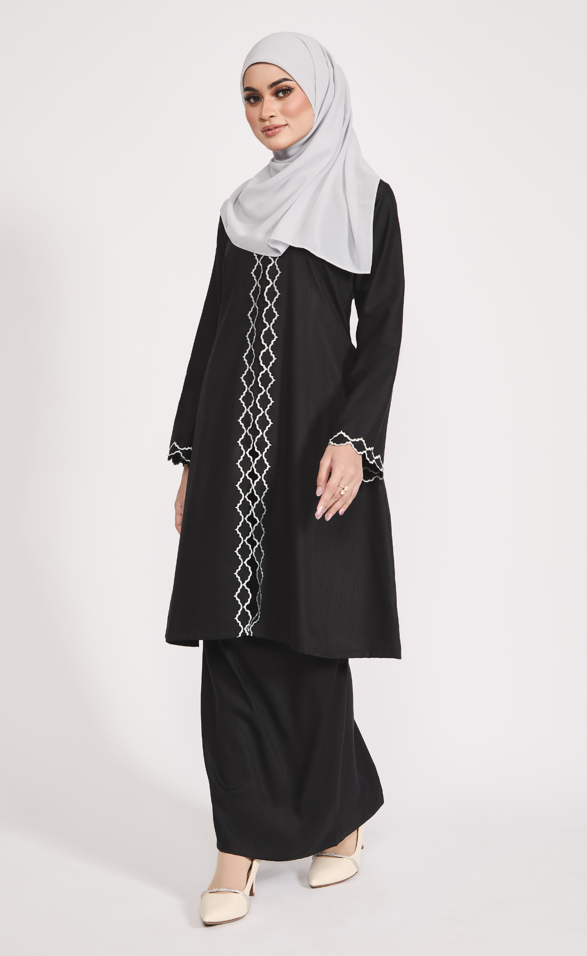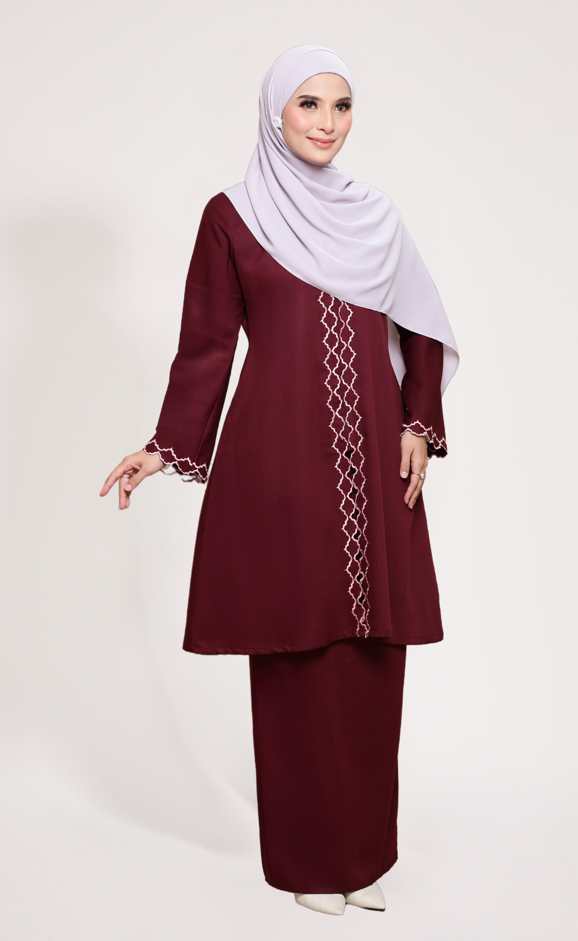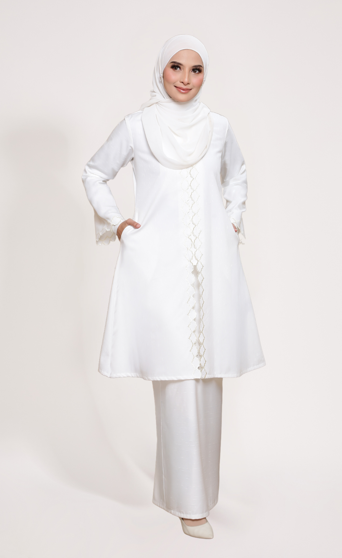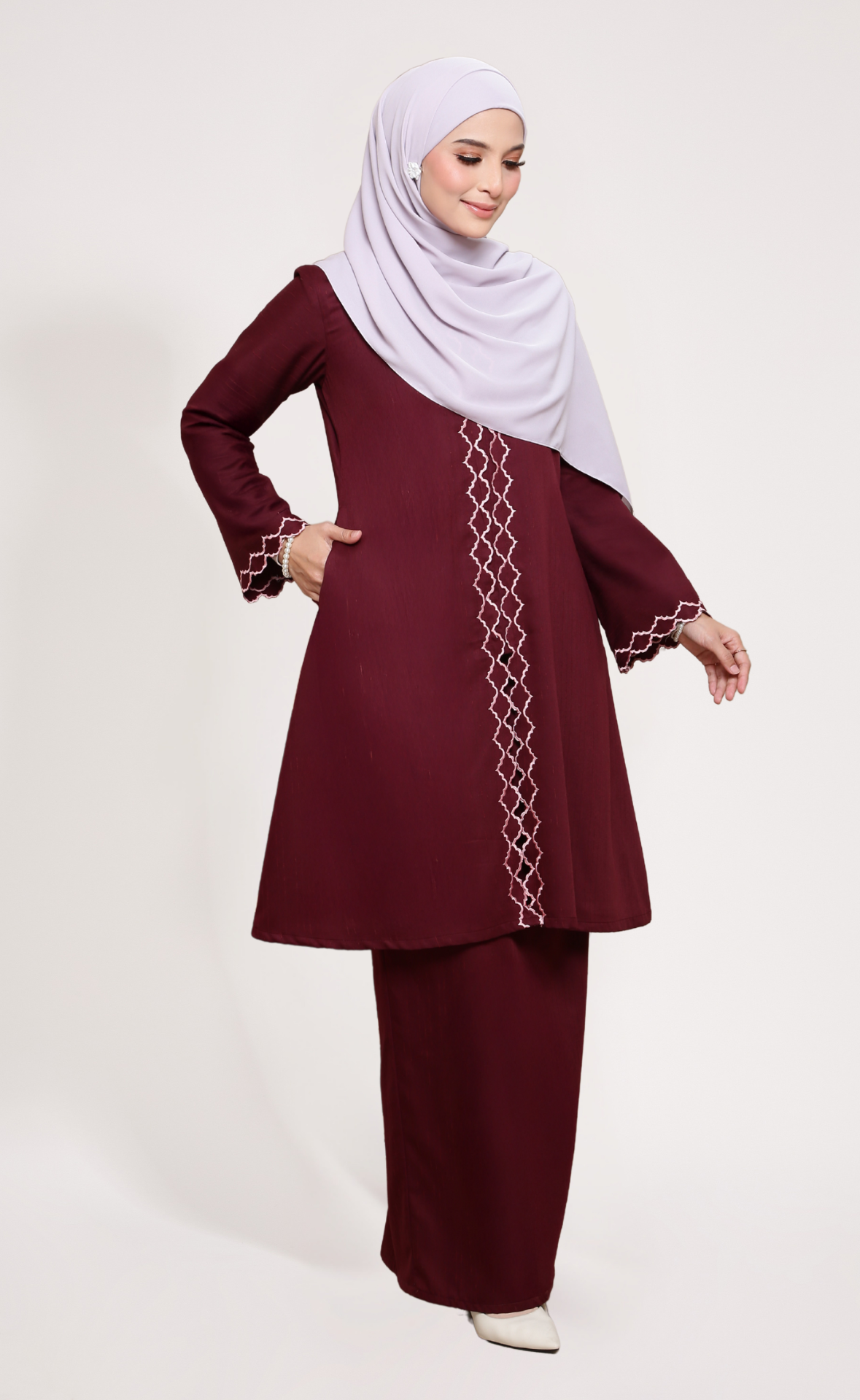Dihiasi dengan sulaman minimal berbentuk cengkerang yang melambangkan keindahan dan kilauan mutiara. Warna sulaman dipadankan dengan fabrik untuk mencipta kontras lembut yang elegan, sesuai untuk pelbagai acara formal atau kasual.