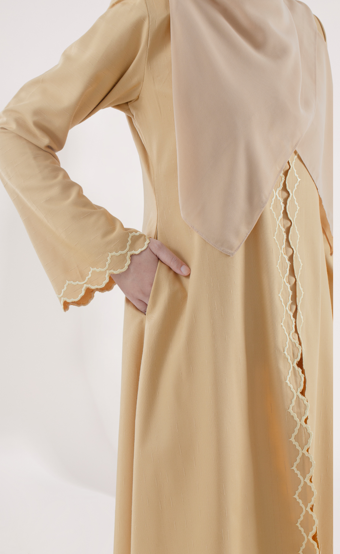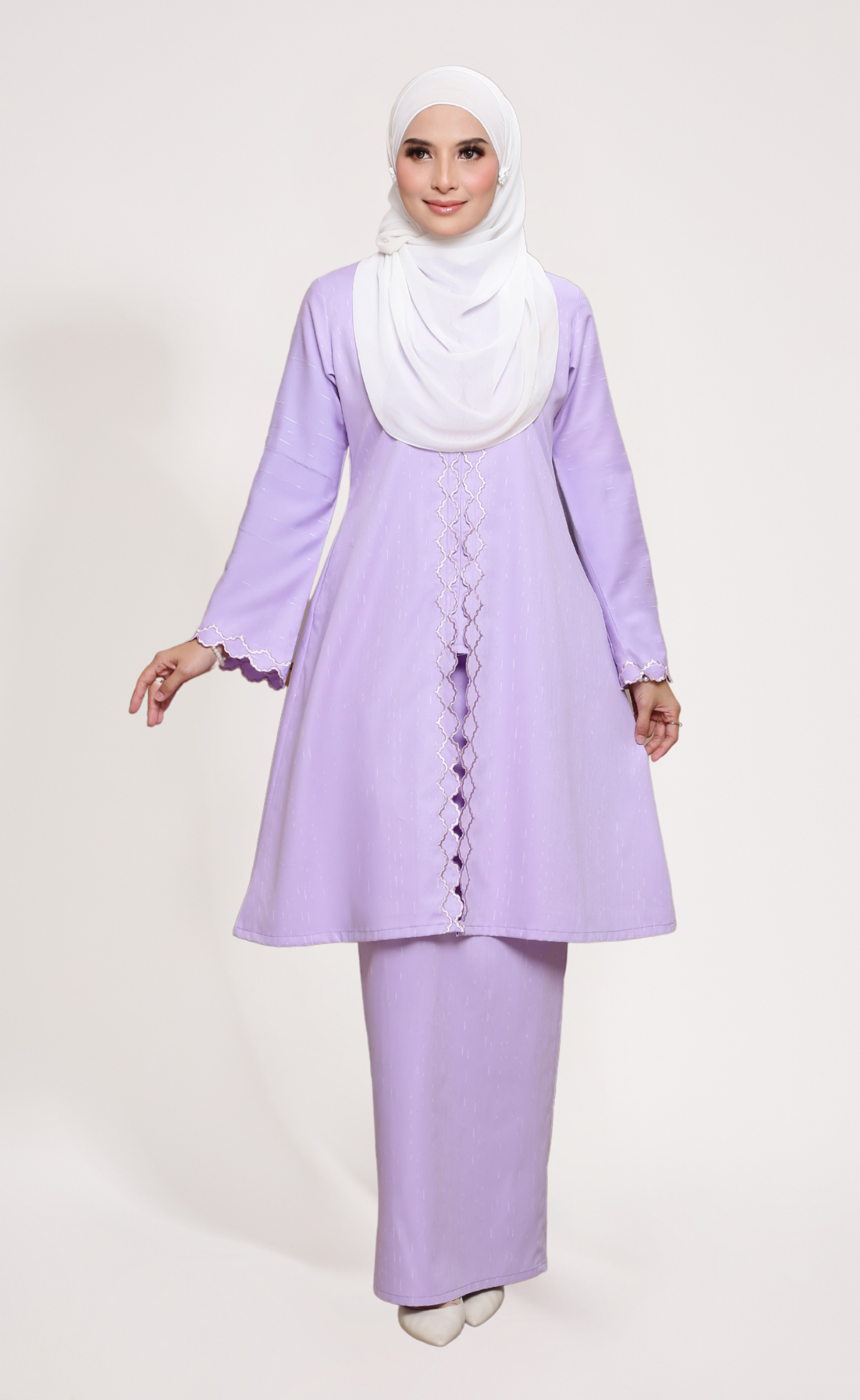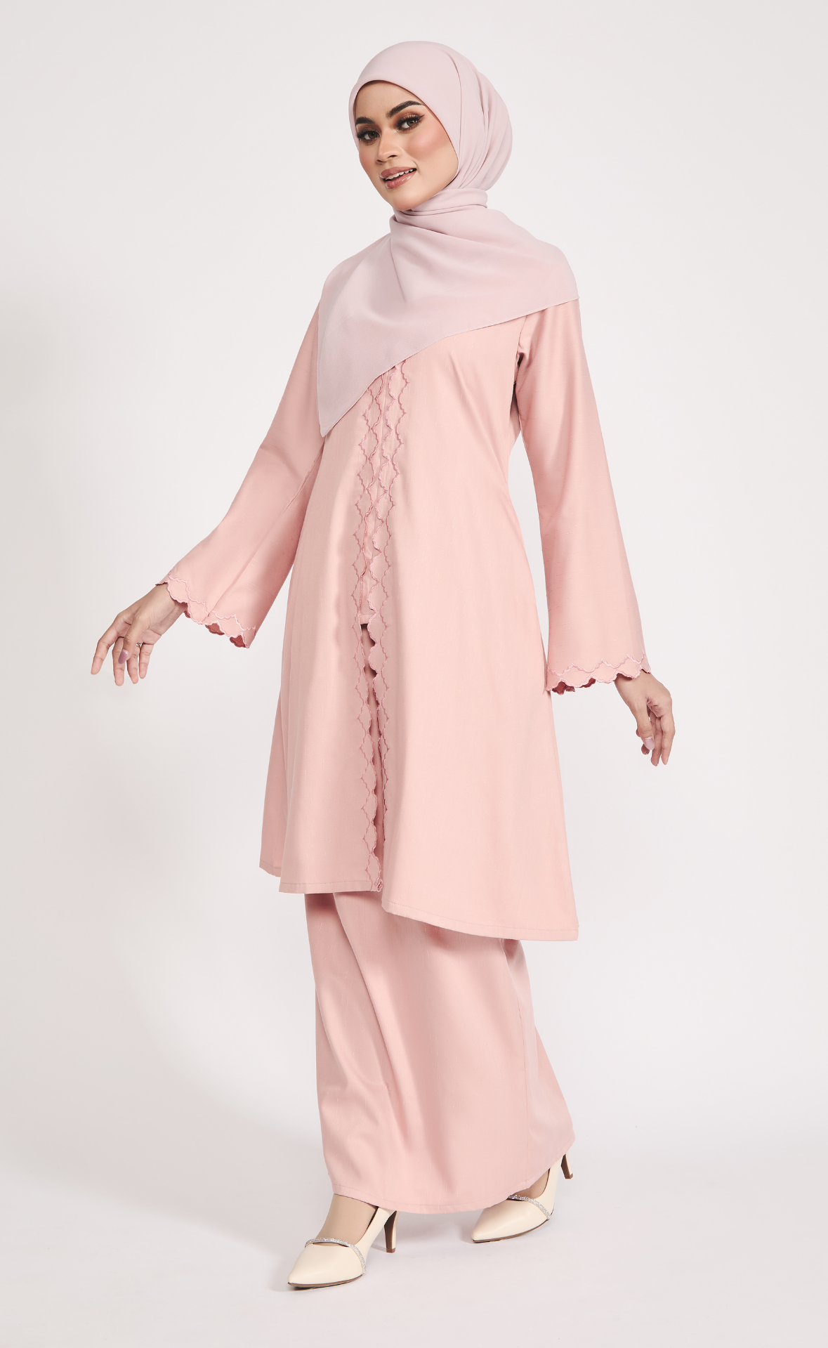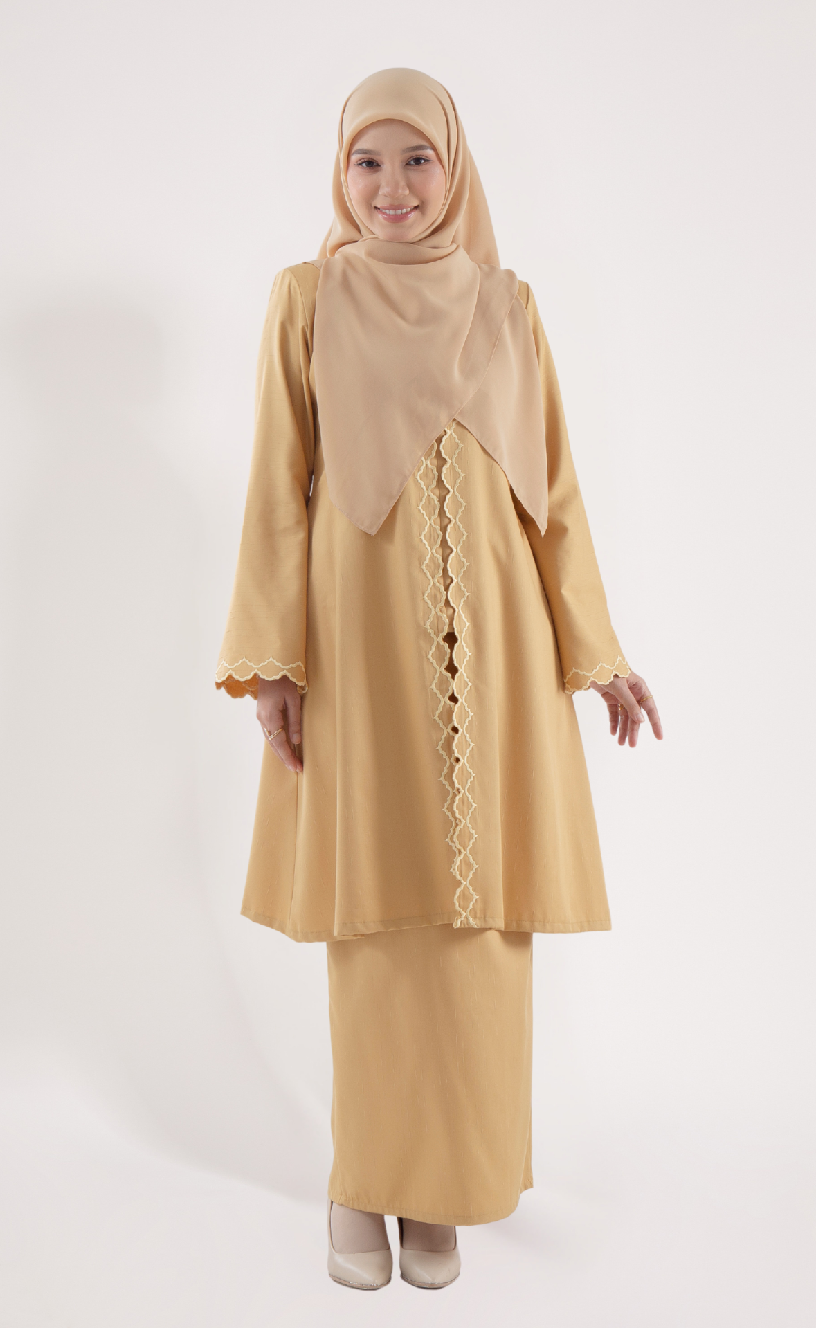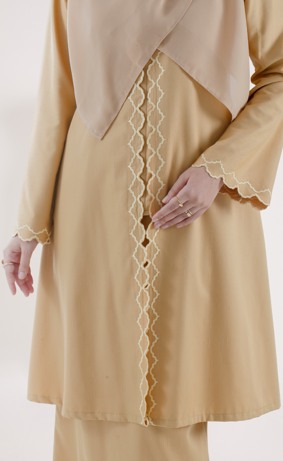 Dihiasi dengan sulaman minimal berbentuk cengkerang yang melambangkan keindahan dan kilauan mutiara. Warna sulaman dipadankan dengan fabrik untuk mencipta kontras lembut yang elegan, sesuai untuk pelbagai acara formal atau kasual.