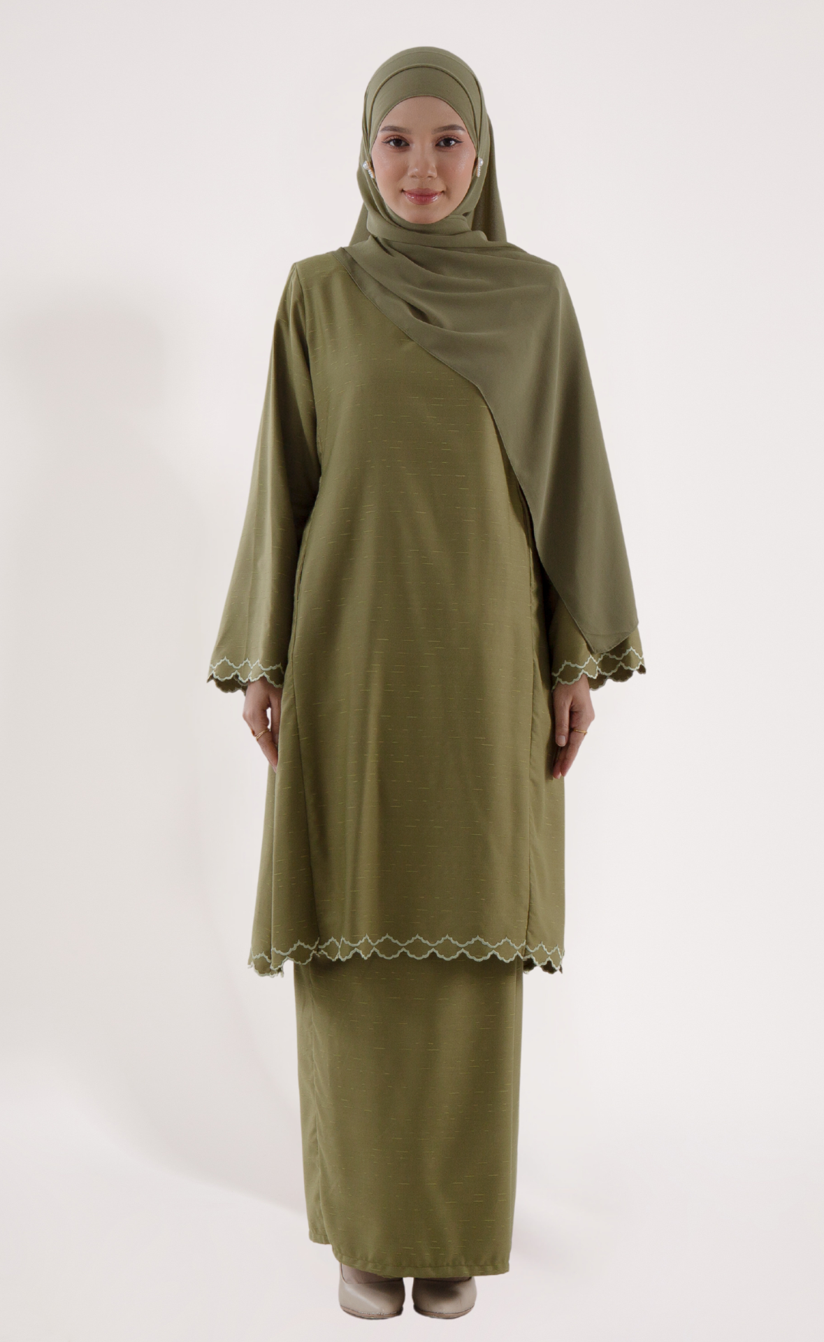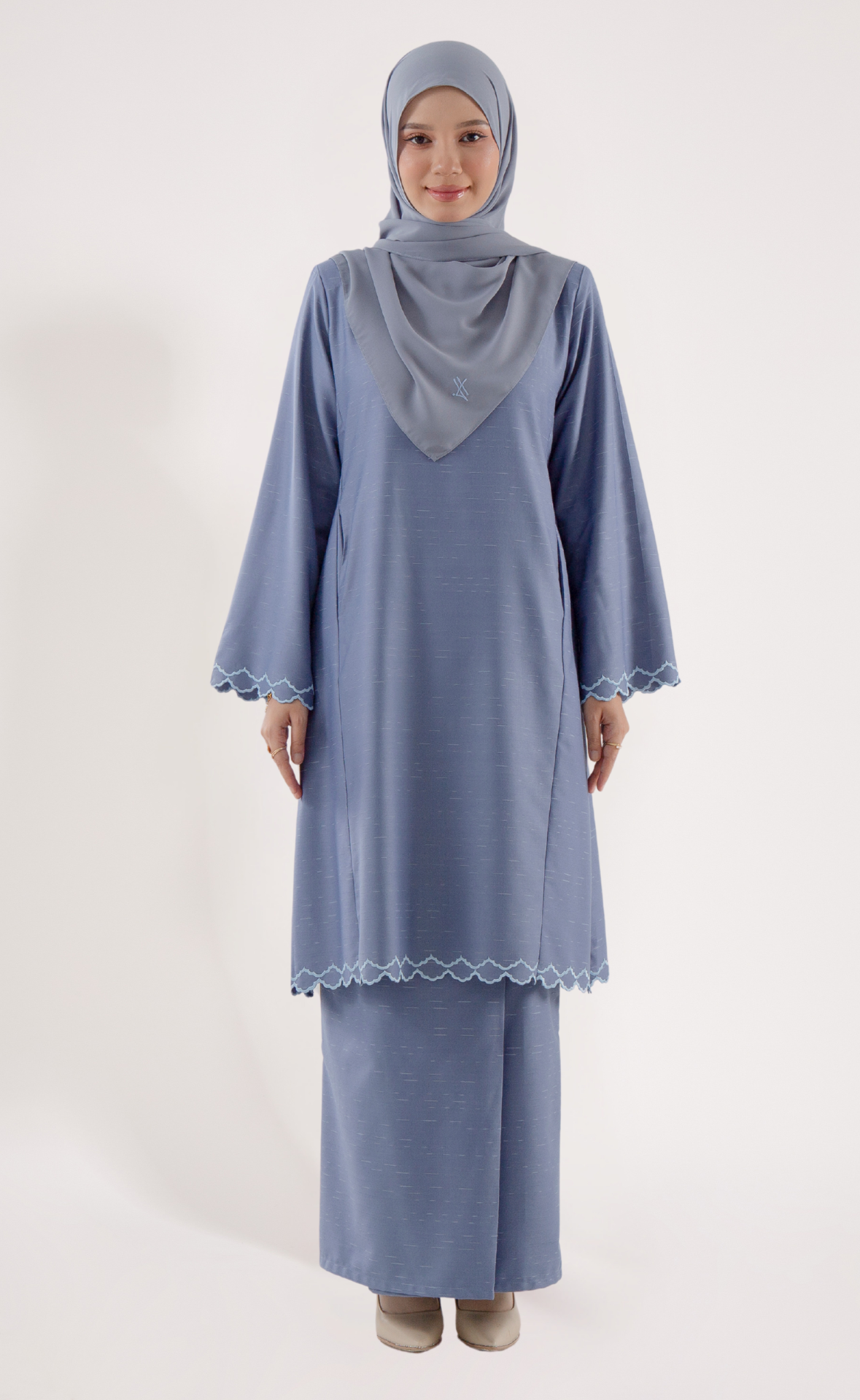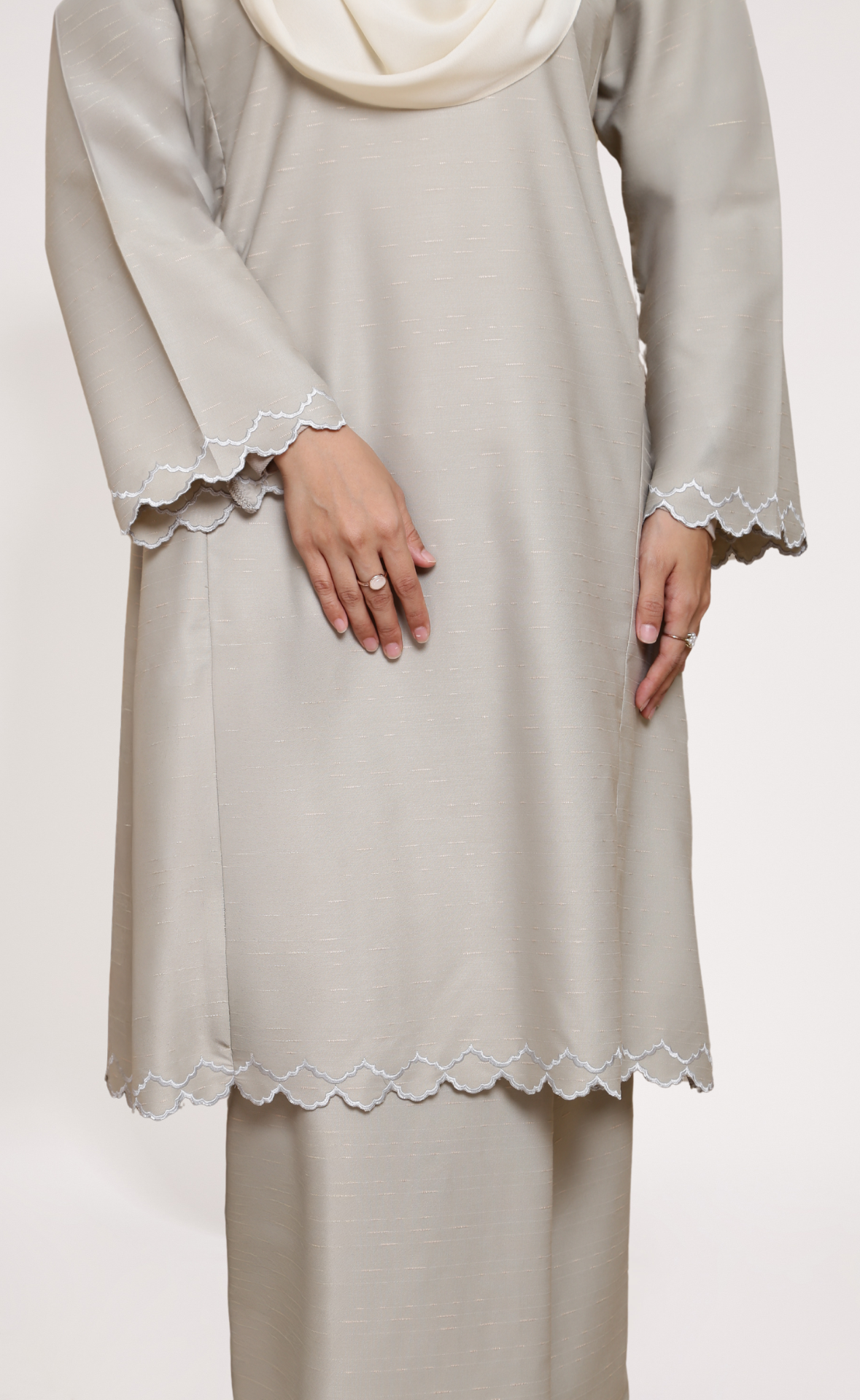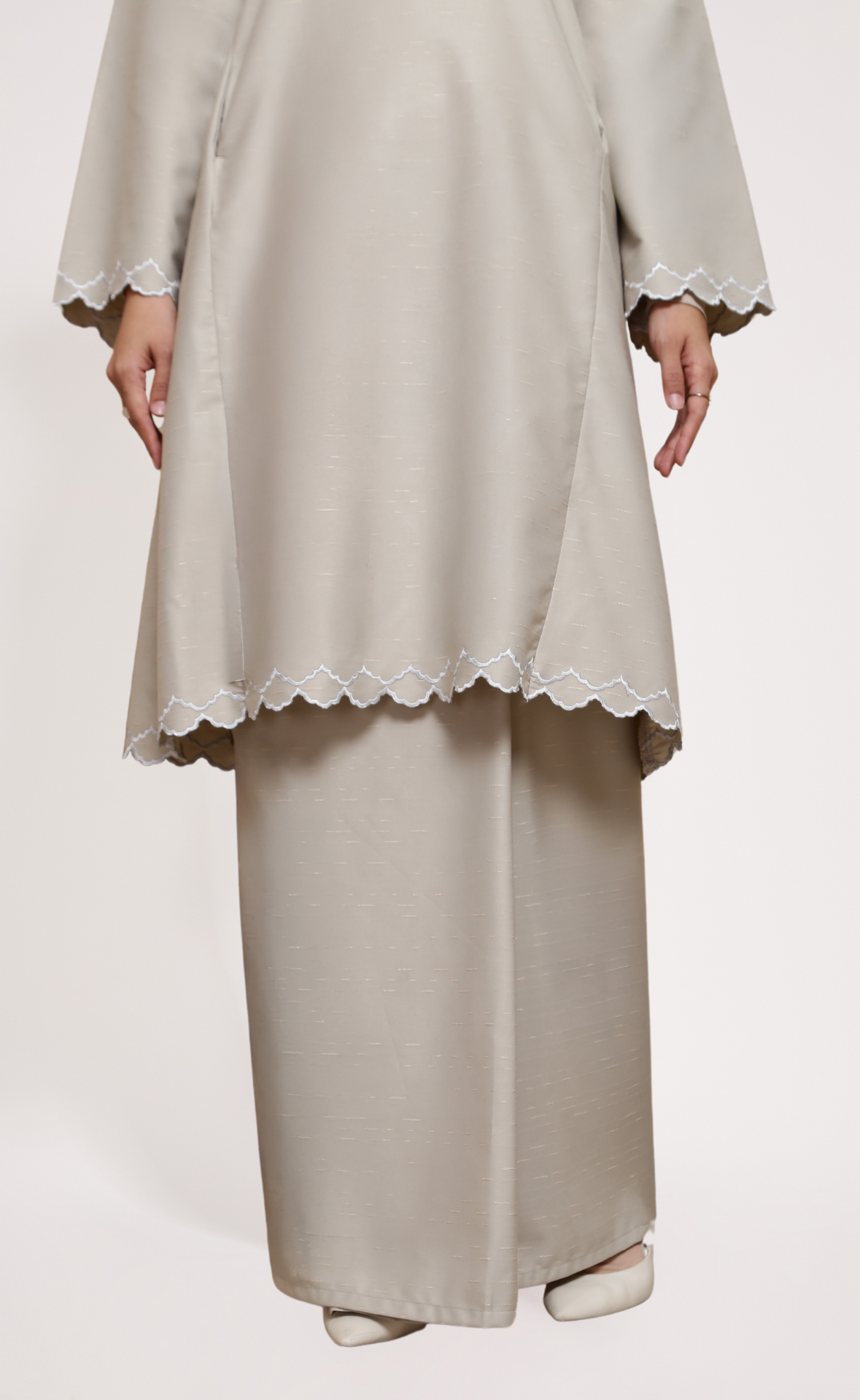 Dihiasi dengan sulaman minimal berbentuk cengkerang, yang melambangkan keindahan mutiara, sulaman ini memberikan sentuhan feminin yang lembut dan elegan. Warna benang sulaman dipadankan dengan fabrik untuk mencipta kontras harmoni yang menawan.