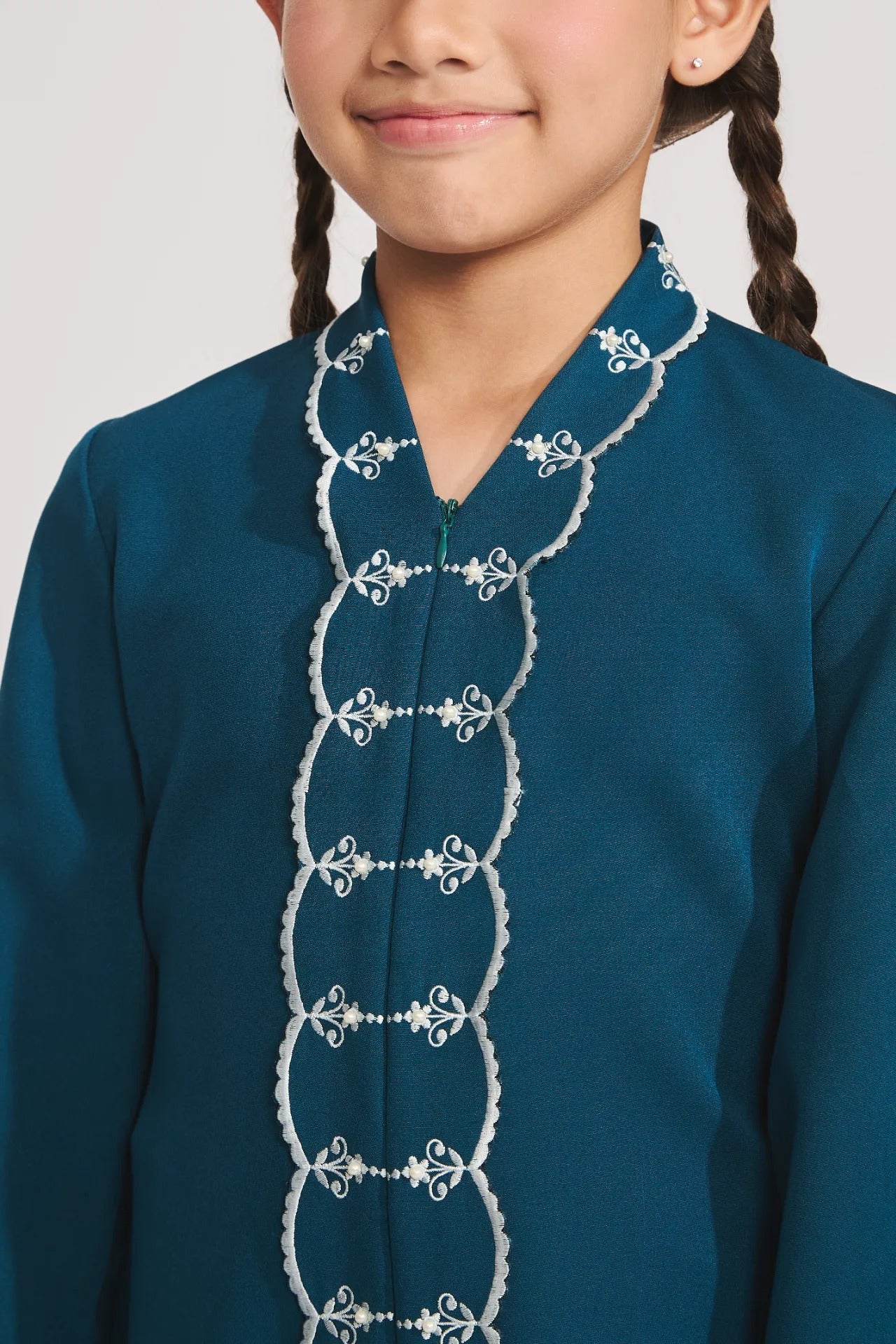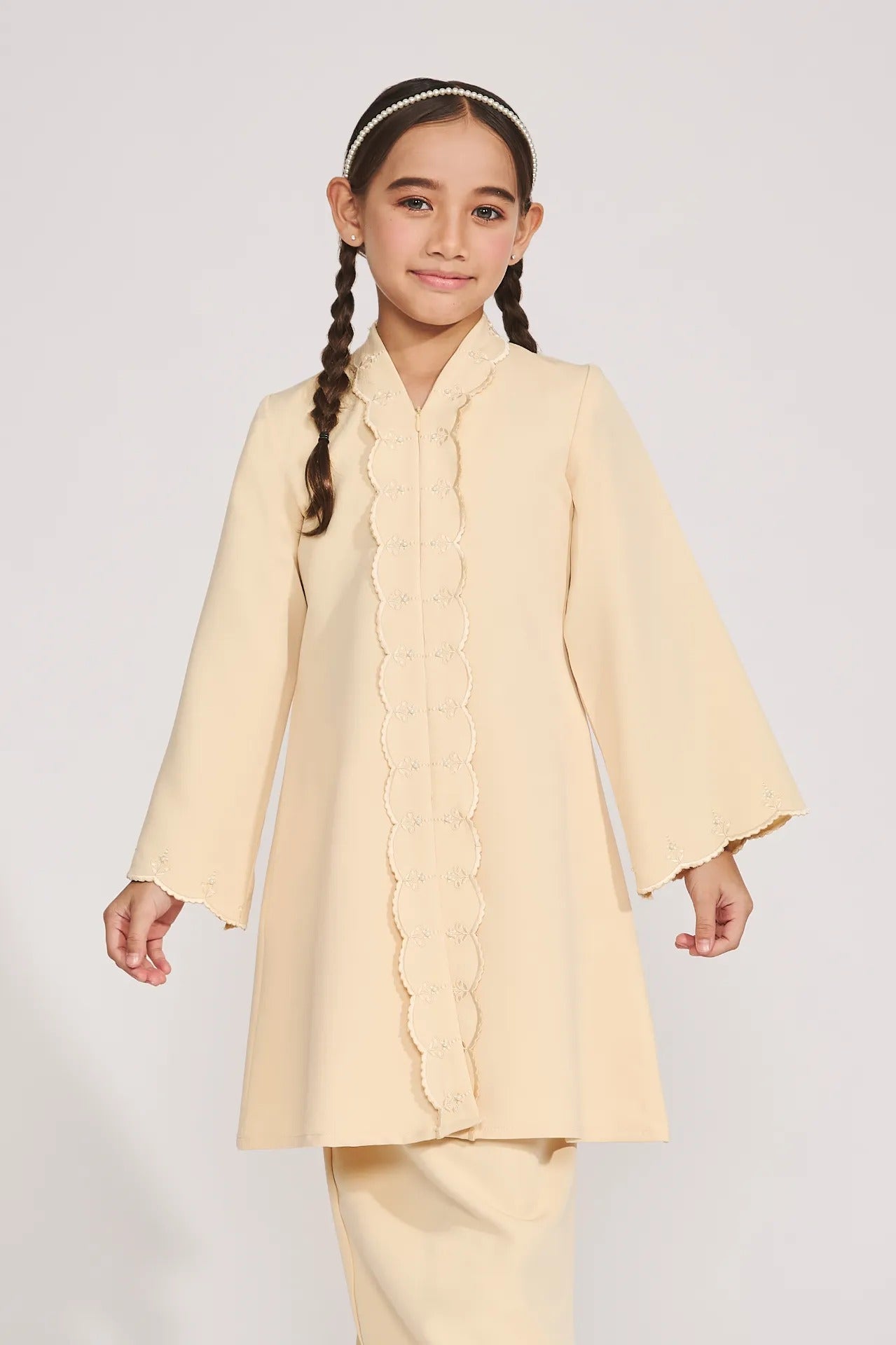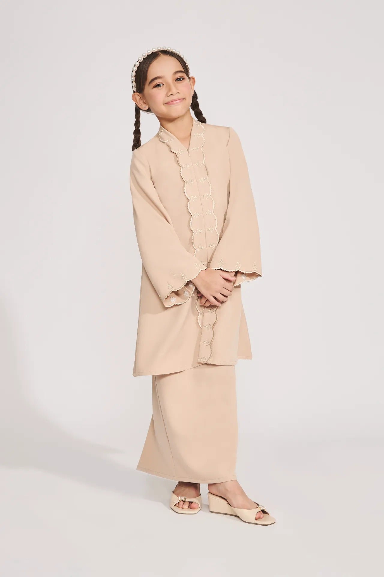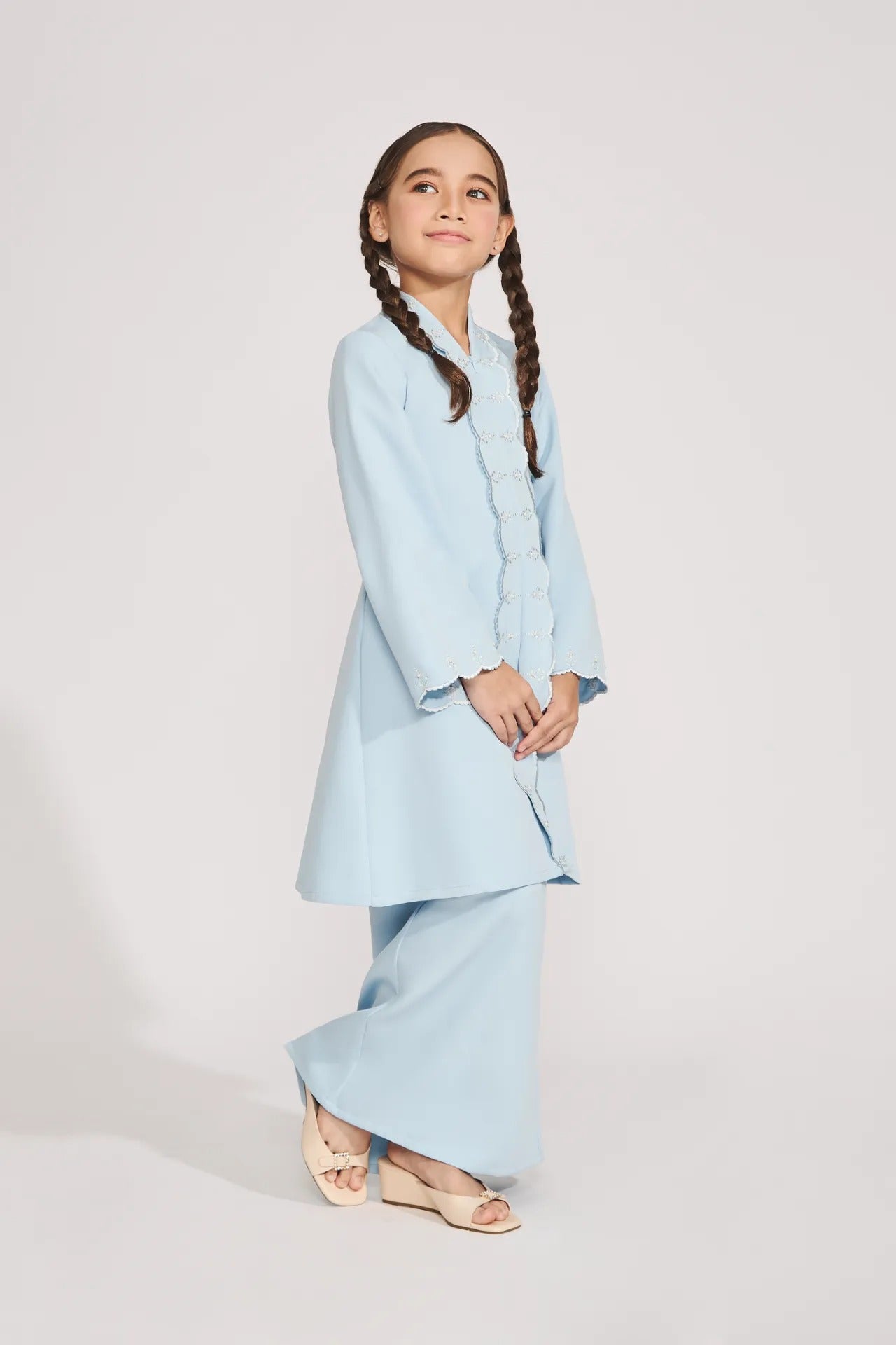 Diinspirasikan daripada versi dewasa, sulaman pada kebaya ini telah disesuaikan untuk kanak-kanak. Perincian sulaman halus yang dihiasi dengan mutiara memberikan sentuhan elegan yang lembut dan sesuai untuk si kecil.