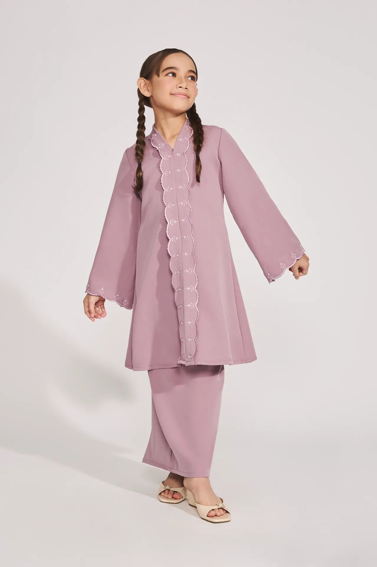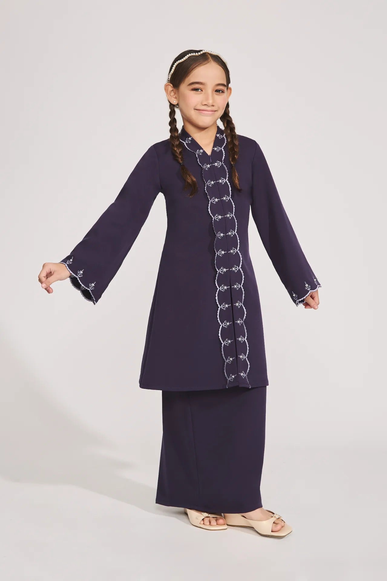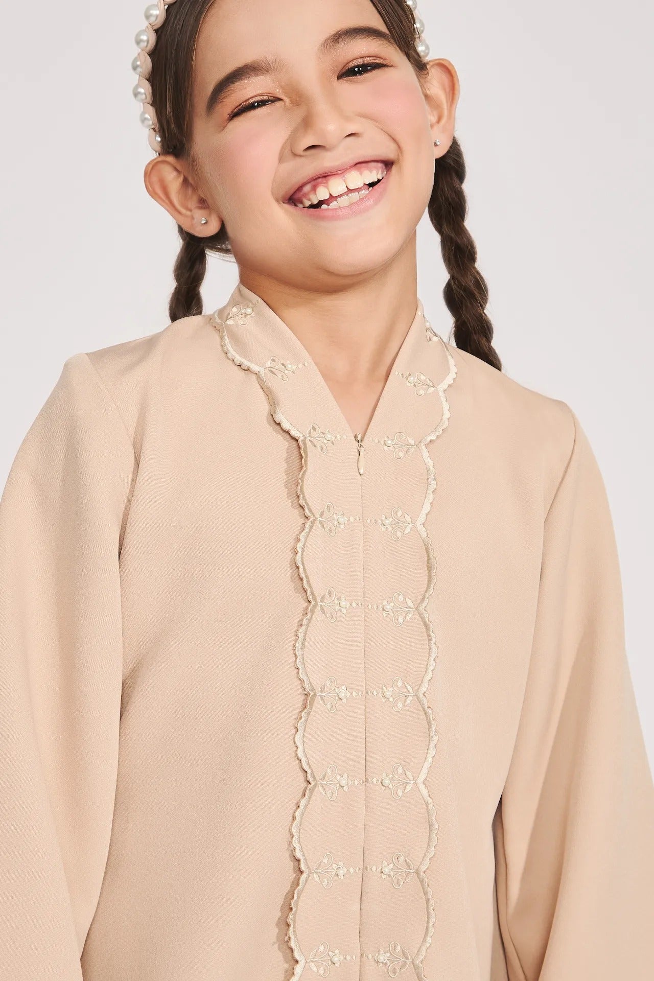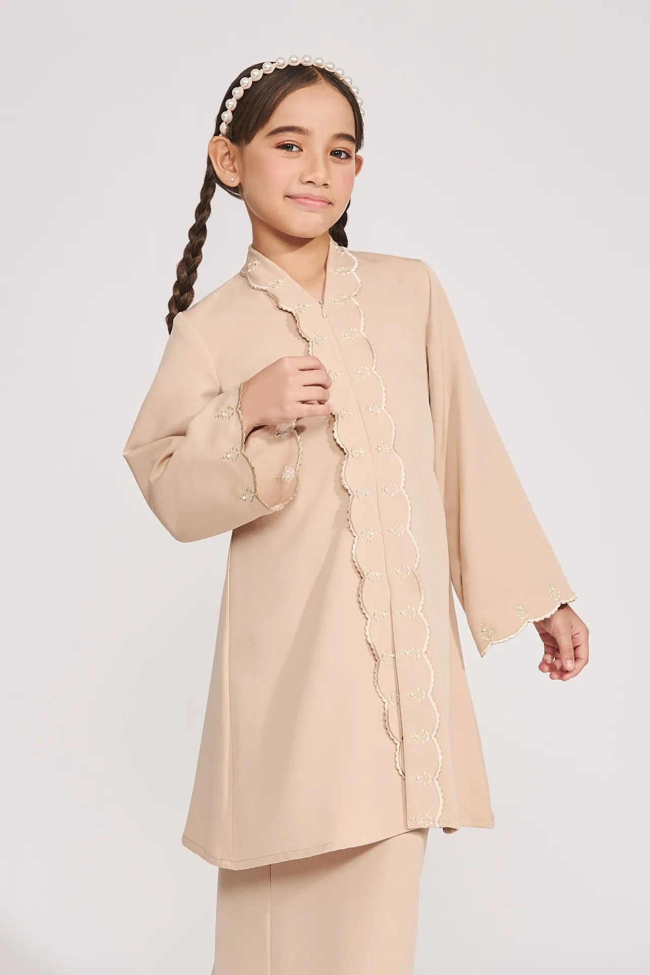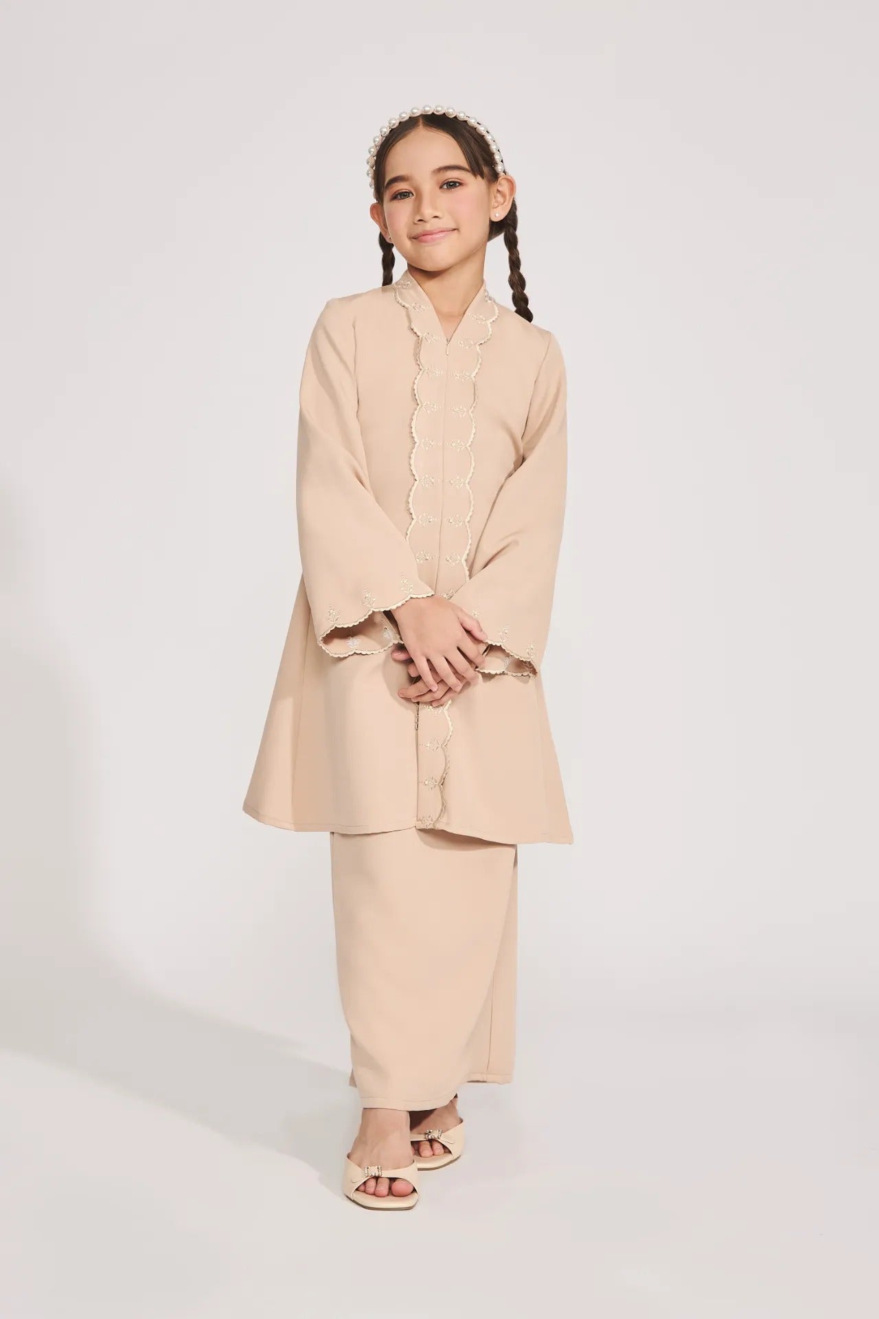 Diinspirasikan daripada versi dewasa, sulaman pada kebaya ini telah disesuaikan untuk kanak-kanak. Perincian sulaman halus yang dihiasi dengan mutiara memberikan sentuhan elegan yang lembut dan sesuai untuk si kecil.