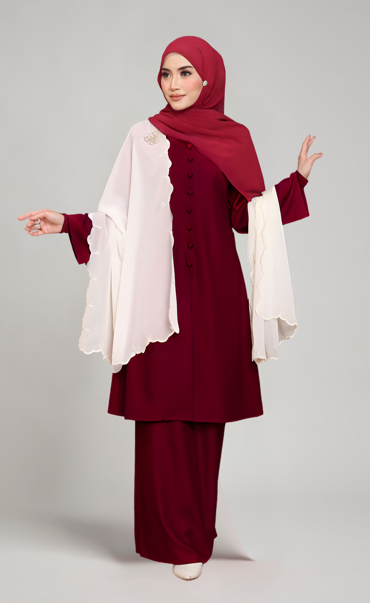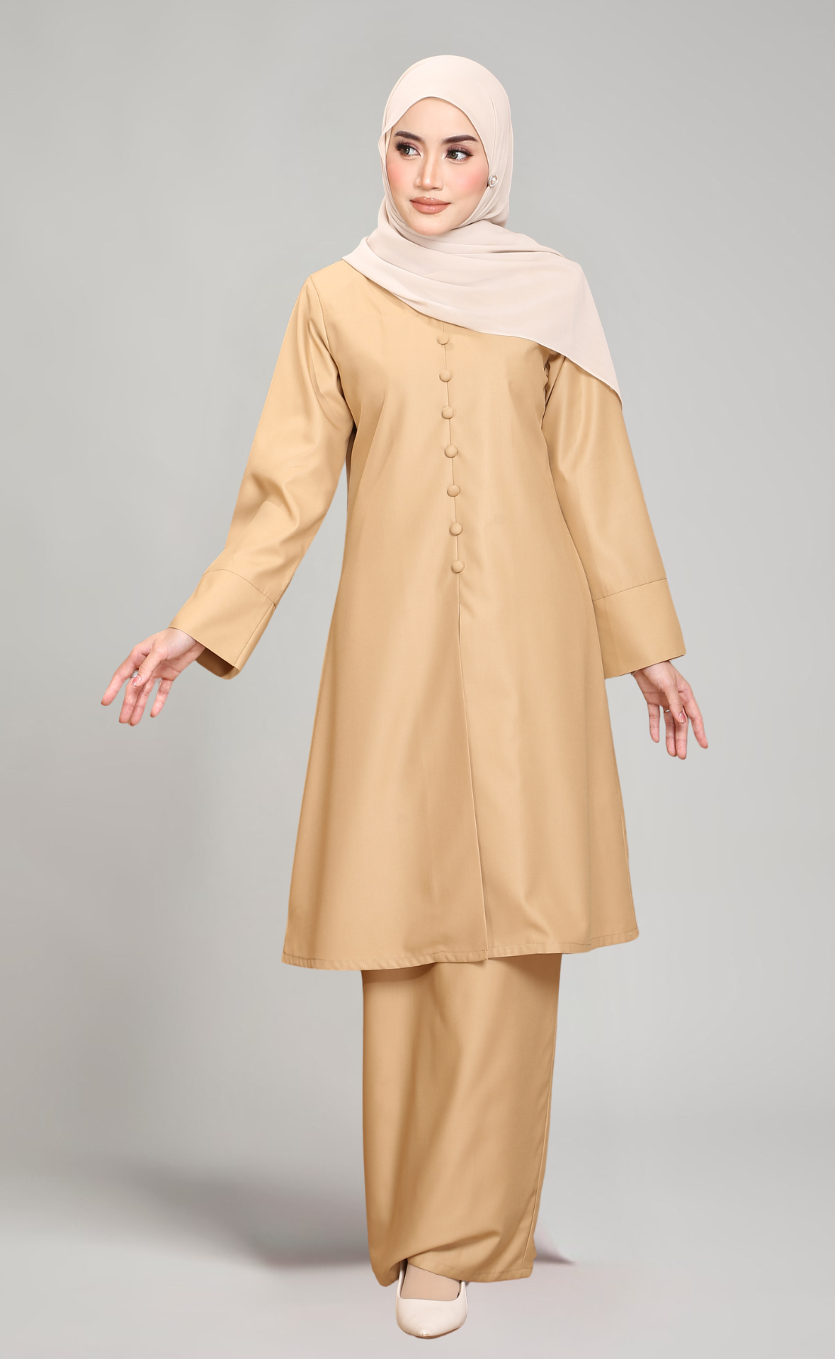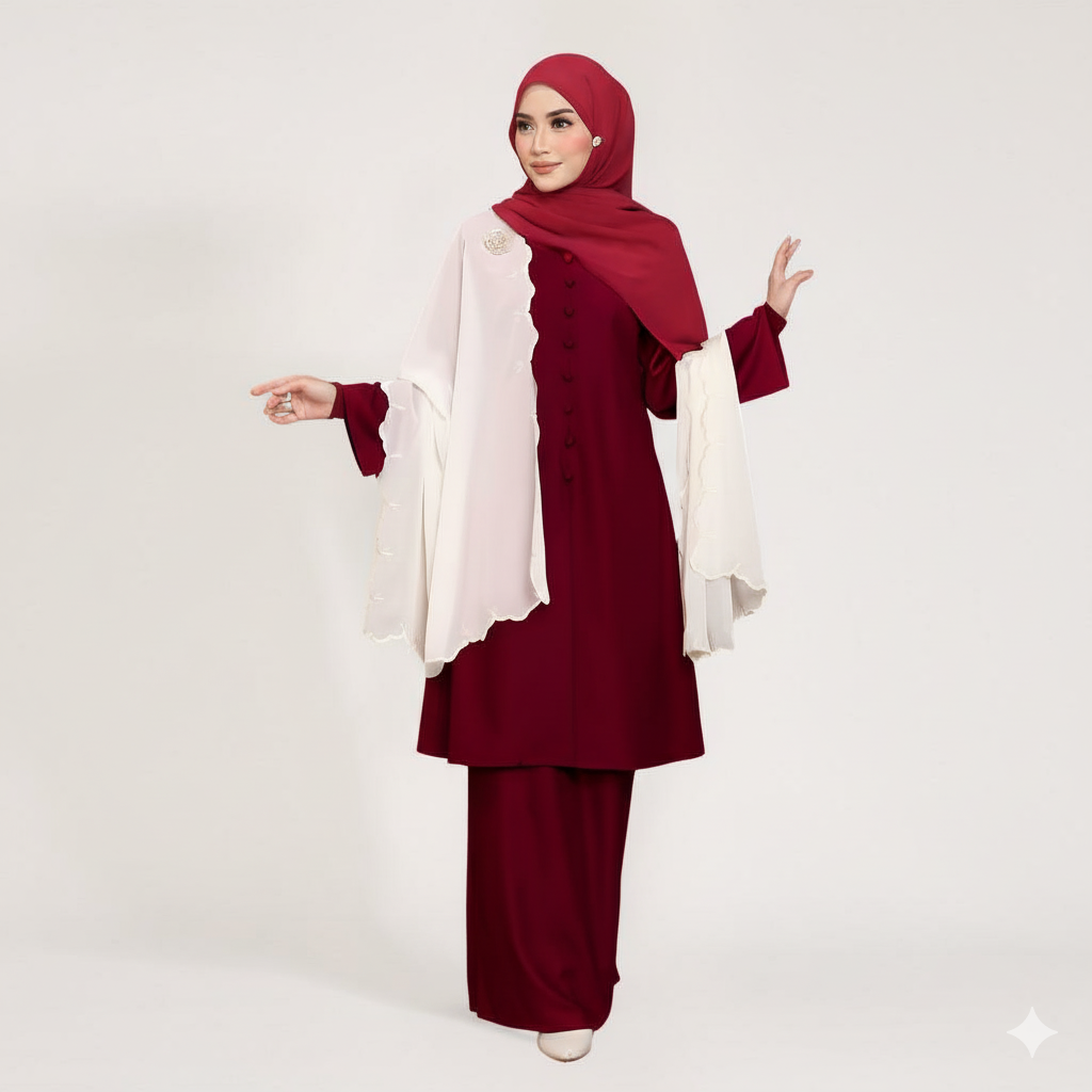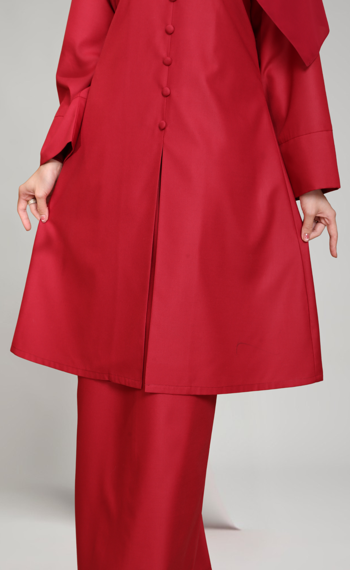 - Lengan lebar dengan cuff yang menambahkan gaya moden dan elegan