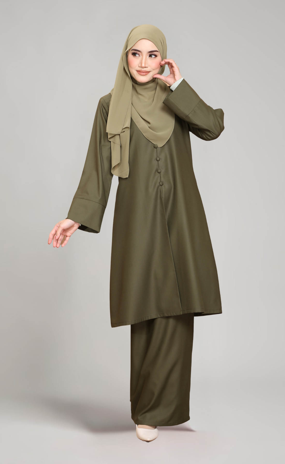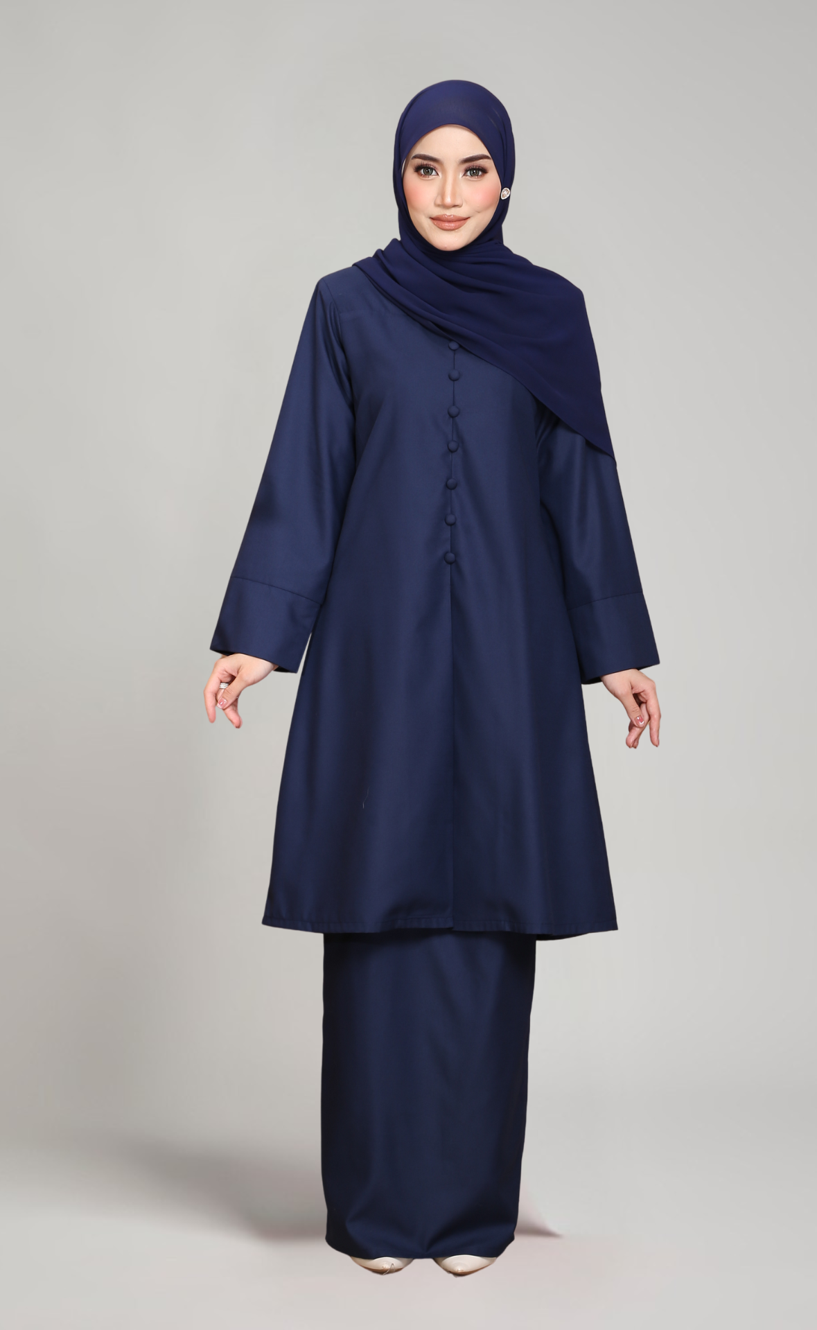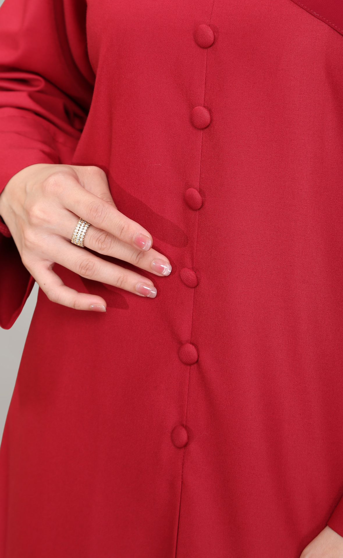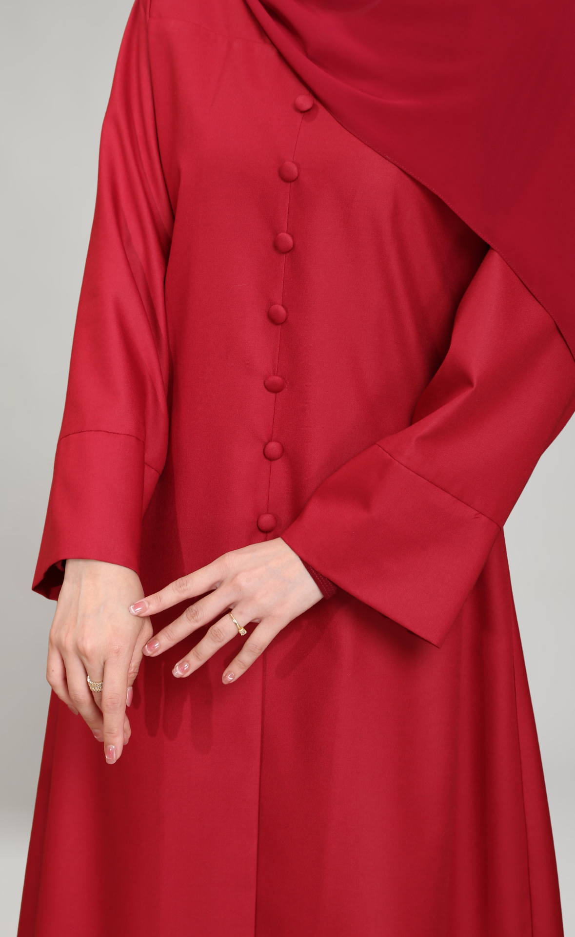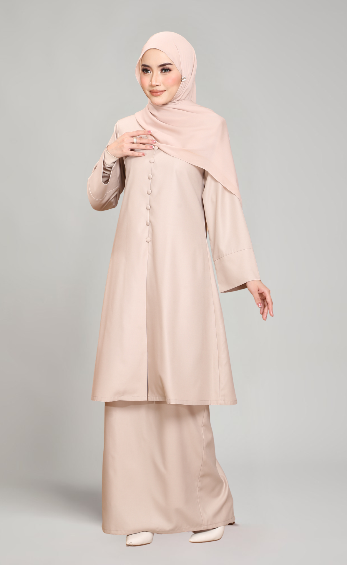 - Lengan lebar dengan cuff yang menambahkan gaya moden dan elegan