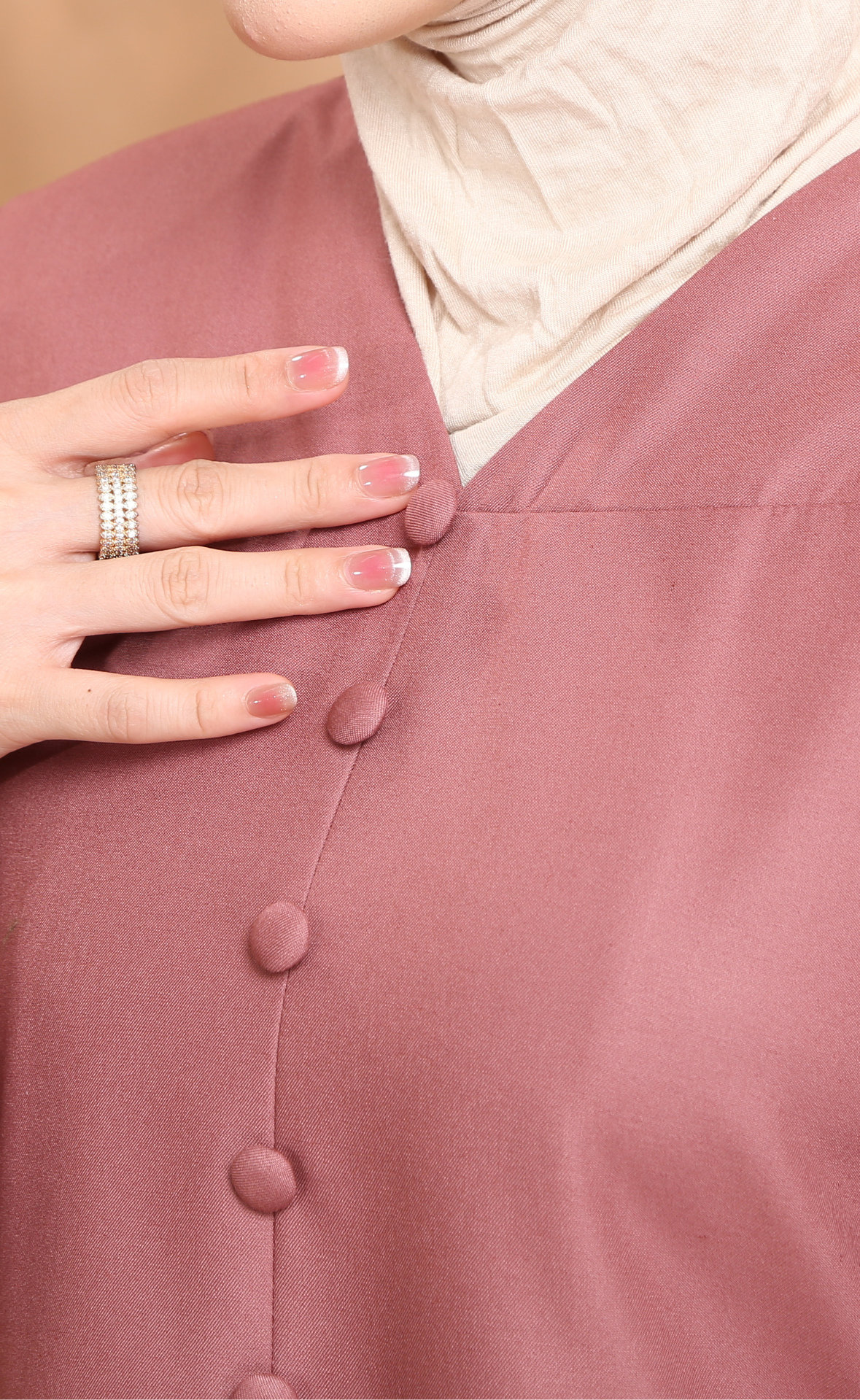 - Rekaan leher V yang kemas dan dummy button sebagai elemen estetik yang eksklusif.